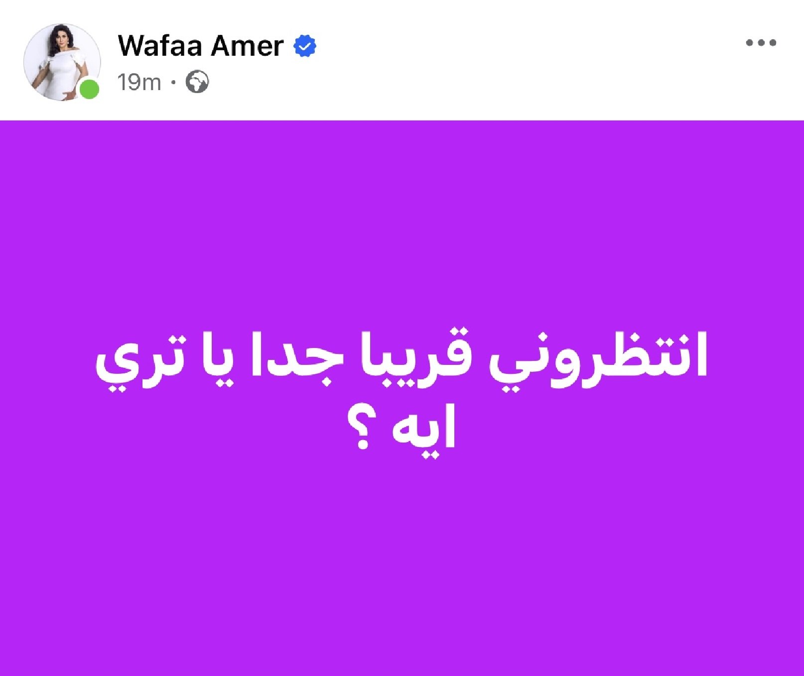 وتساءلت وفاء في منشورها قائلةً: "انتظروني قريباً جداً… يا ترى إيه!؟"، ومكتفيةً بهذه العبارة من دون الكشف عن أي تفاصيل إضافية حول طبيعة المفاجأة، ما جعل الجمهور يتكهن باحتمالية عودتها القريبة بعمل فني جديد أو مشروع مختلف.