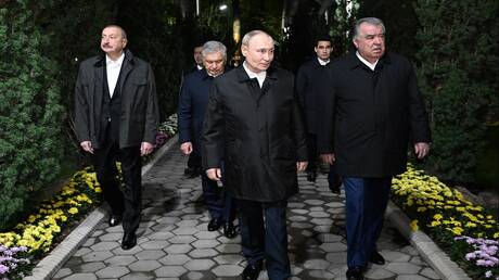 بوتين في نزهة مسائية برفقة زعماء رابطة الدول المستقلة في حديقة المقر الحكومي بدوشنبه